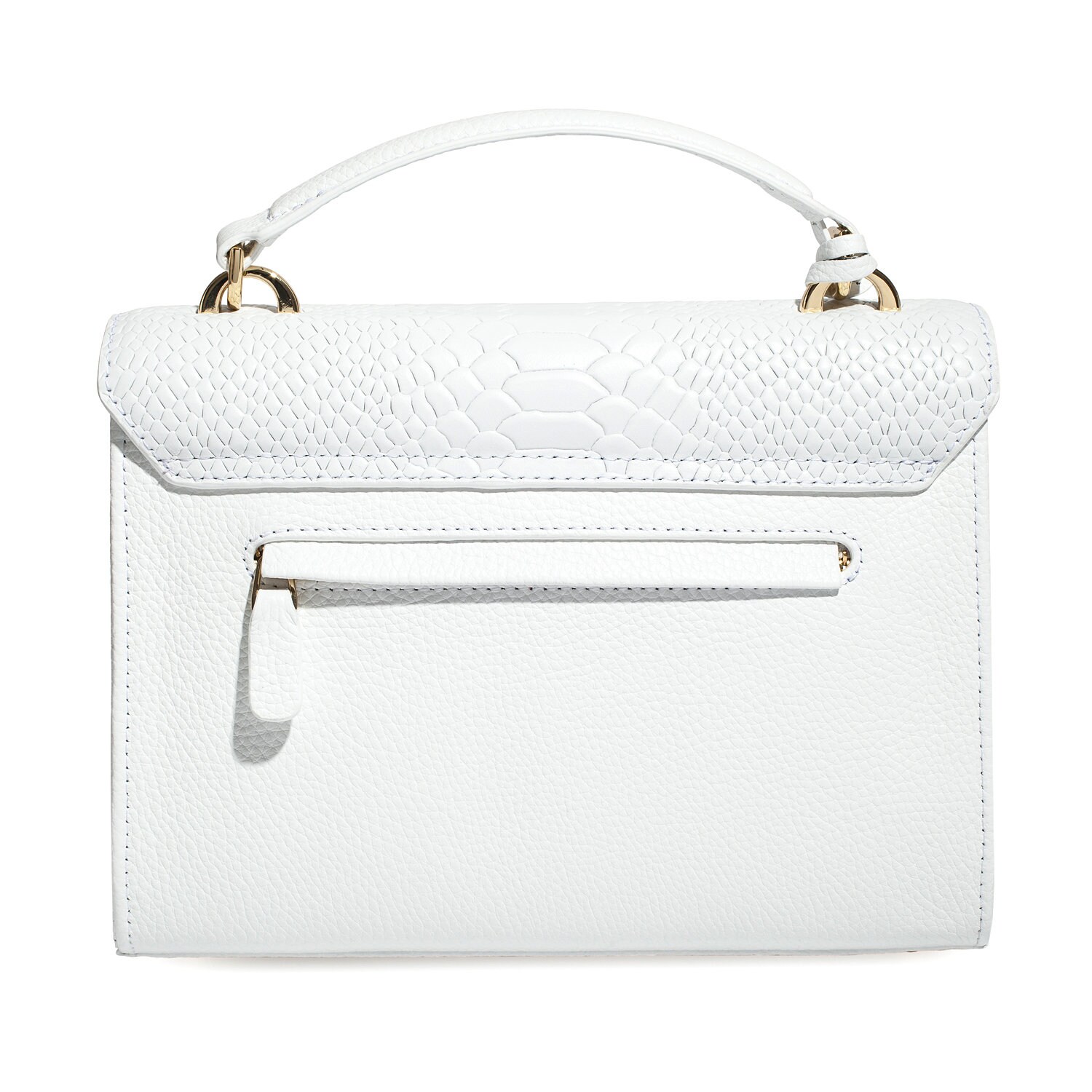White genuine leather handbag from Ukrainian designer Katerina Fox. The internal space of a bag is equipped with three spacious compartments and two patch-pockets and one zipper pocket. One of the spacious compartments is closed with a zipper. The bag is closed with a clasp. The bottom of the bag is protected with metal legs. There is a long handle that allows you to wear the bag on the shoulder. The kit also includes a storage bag.