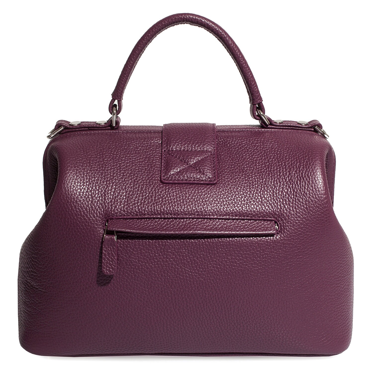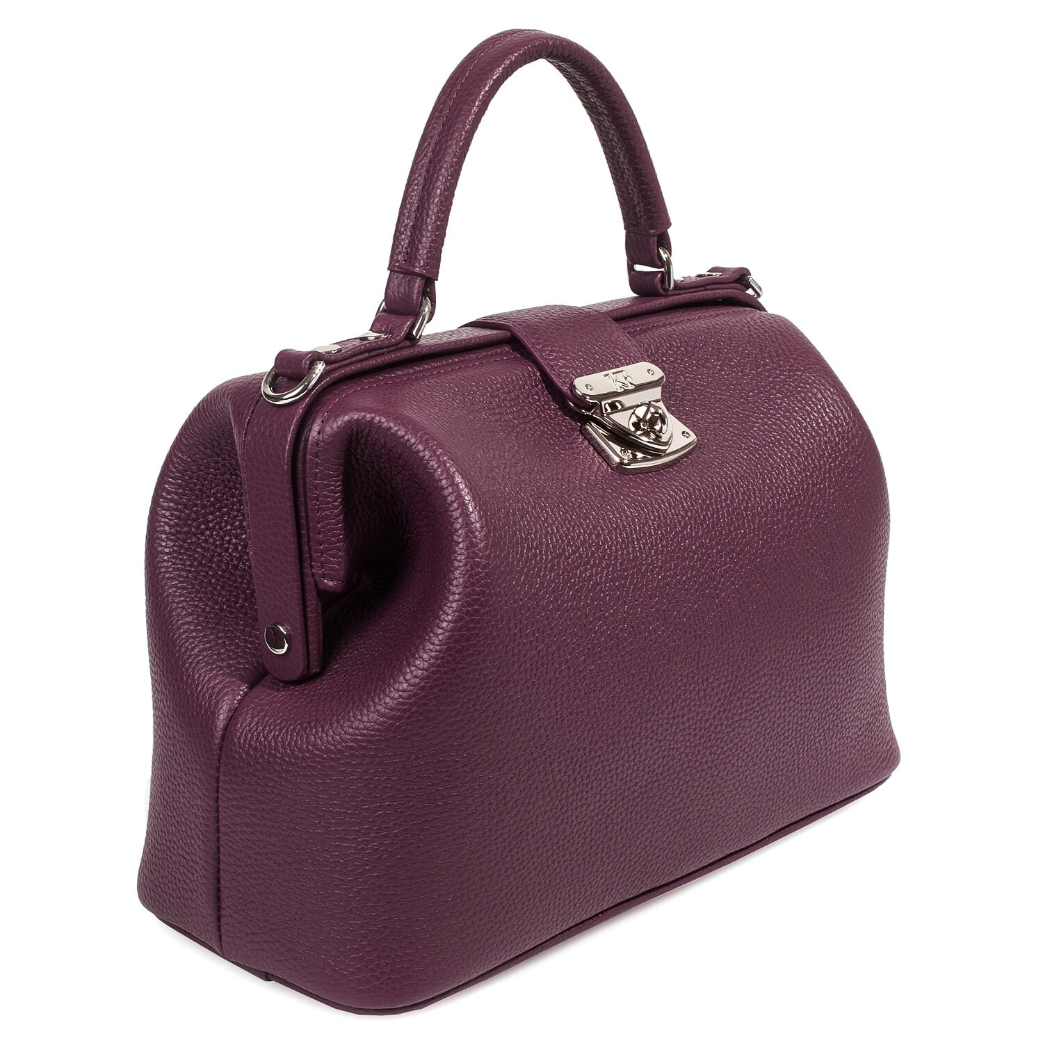 Women's leather doctor bag made of genuine leather, hardware with galvanic coating and microfiber lining. The internal space of a bag is equipped with one spacious compartment, two patch-pockets and one zipper pocket. The bag is closed with a clasp. The kit also includes a storage bag.
